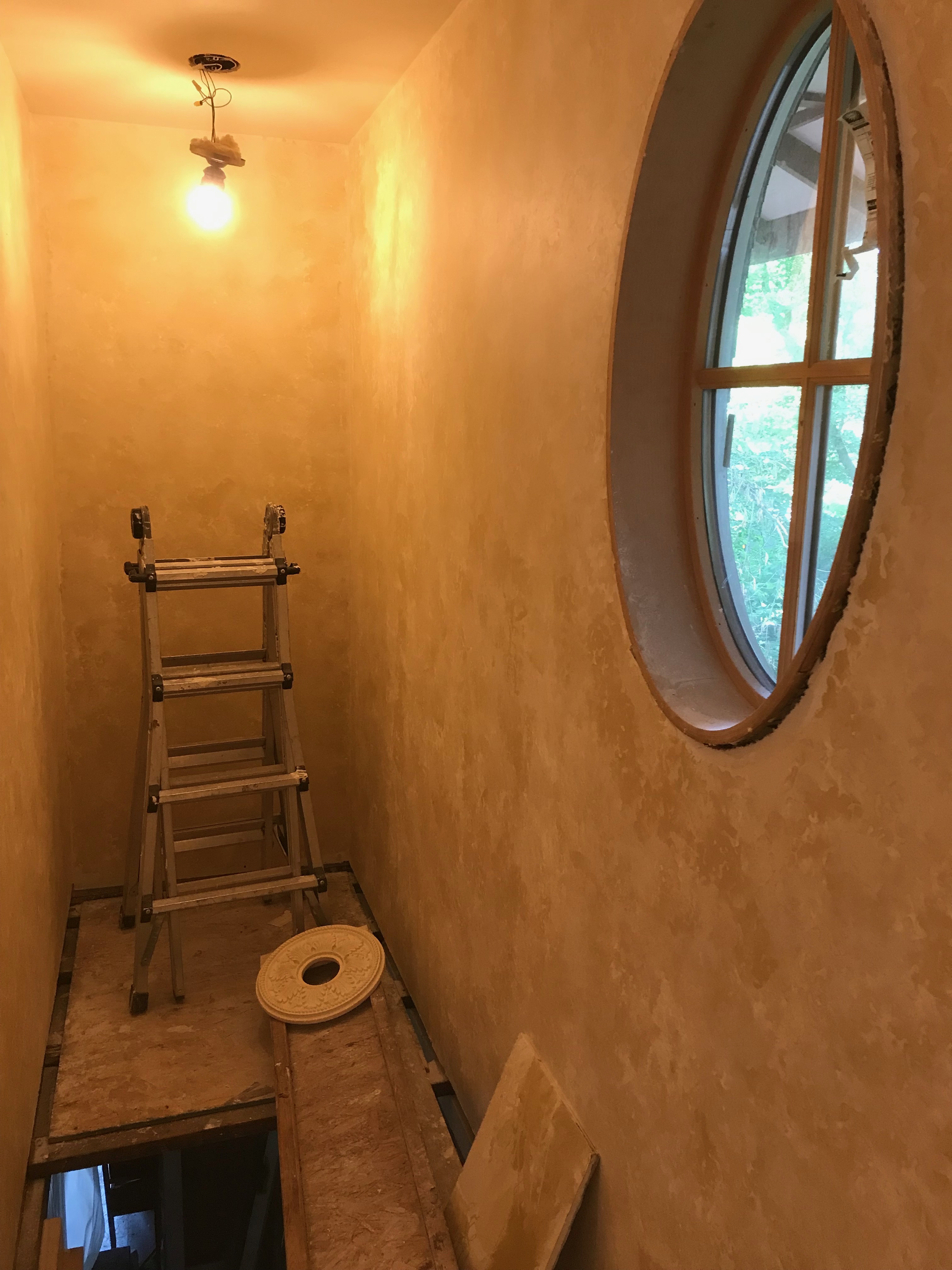 We found this stained glass pendant at the New Brighton Habitat for Humanity ReStore. Steven shortened the chain and installed it over the stairway using the platform we had installed for the sheetrock installation.